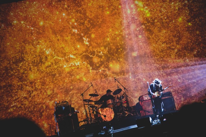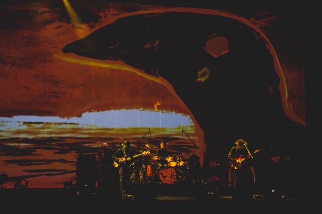 スクリーンに静かに雪が降り続ける中、荒ぶるリズム隊とクールで美しいギターの音色とのバランスが絶妙な、曲は「真っ白な夜に」。ライブはちょうど折り返し地点に差し掛かり、ここまでは3分程度の曲が多かったが、ここから3曲はいずれも5分を超える大作へと突入してゆく。壮麗なアニメーションを駆使して創世記的な神話世界を描く「SOL」、映像ではコンテンポラリーダンサー・森山開次を中心としたダンス&演劇パフォーマンスをフィーチャーし、音源では坂本龍一が参加した「風追い人(前編)」は、音と映像がぴたりと寄り添いインストゥルメンタルの醍醐味をたっぷりと伝えてくれる。メランコリックなスローバラード「Λ-CDM」では、大木がキーボードとギターを使い分けながらリリカルなフレーズを積み重ね、一悟の強烈なシンバル連打のクライマックスへ至る、7分を超える壮大な音による叙事詩。音が消えてしばらく動けないほど、その緊張感と迫力はすさまじい。