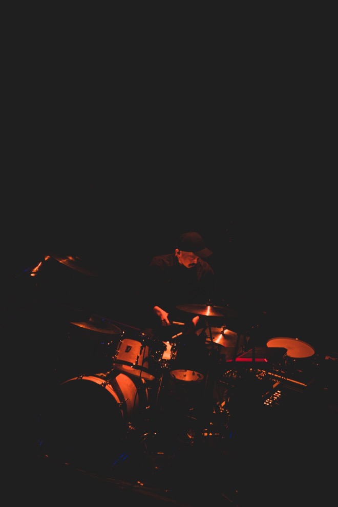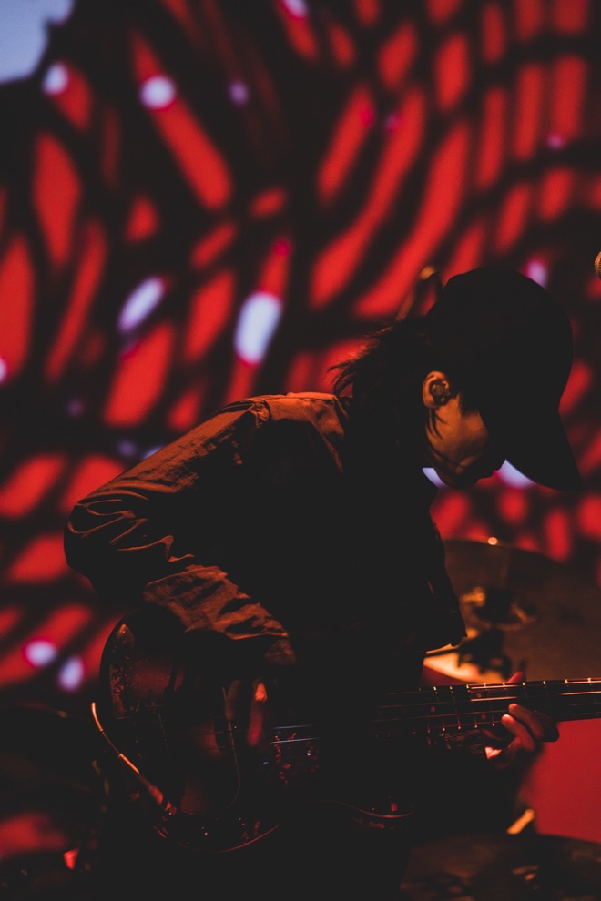インスト曲のみというマニアックなライブに駆け付けたオーディエンスを、「つわものたちよ」とユーモラスに讃えつつ、大木のMCはどこまでも明るくポジティブだ。ねばりつくように重厚なダンスビートの「en」では、ルーパー・エフェクターを使ってギターの音を重ね、その間にアコースティックギターに持ち替える技を見せる。「Dawn Chorus」を経て「room NO.138」では、五拍子の変則ビートに乗せて佐藤雅俊がご機嫌なアップライトベースを聴かせる。「アルフヘイム」はこの日一番のレア曲で、シングル「最後の星」のカップリングでのみ聴けるものだ。この日がライブ初披露で、アコースティックギターによる静かな前半から、壮大なロックバラードに展開する後半へ、あえて映像を使わずに強烈な逆光と音のパワーだけで勝負する、無駄を排した演出が冴えわたる。