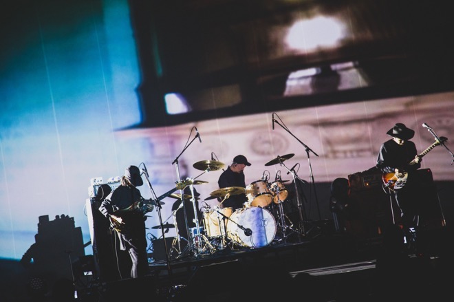 背後のスクリーンに映る幻想的な風景、オープニングSEは「at」、メンバー登場。浦山一悟のドラムが雷鳴のように青い闇を切り裂く、1曲目は2005年のアルバム『and world』からの「water room」だ。インストゥルメンタルと聴いて、穏やかなオープニングを予想していたオーディエンスは度肝を抜かれただろう。続く「usess」も、きわめてテンションの高いロックチューン。「Walking Dada」は、力強い四つ打ちのキックでぐいぐい進むダンスチューンだ。映像も非常に凝っていて、光の粒子の乱舞、ハンドメイドのアニメーション、そしてシュールレアリスティックな画像処理など、ミュージックビデオを駆使して1曲ごとにめまぐるしく変わる。まるで1曲が1編のショートストーリー、サウンドトラックのように目と耳を強烈に刺激してくる。