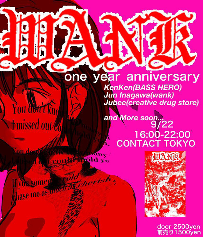 オタクカルチャーとストリートカルチャーを融合させた独自の世界観で注目を浴びている新進気鋭のアーティスト“JUN INAGAWA”が仕掛ける、 好きなものを突き詰めるHEROZたちのクラブイベント<WANK>が1周年を迎え渋谷Contactに帰還する。