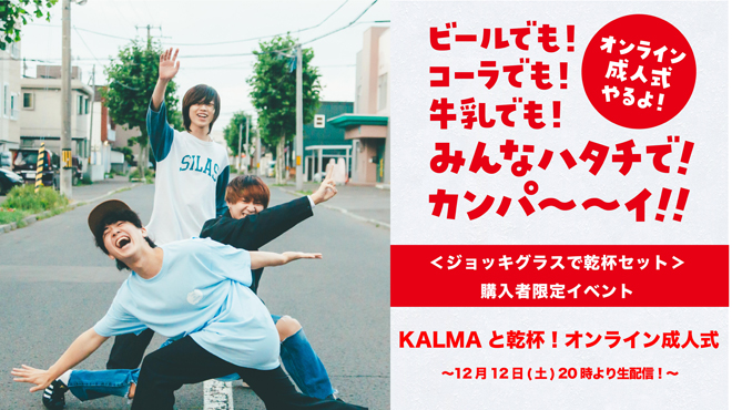 11月25日(水)発売 KALMA 「La La La E.P.」(生産限定 ジョッキグラスで乾杯セット)のリリースを記念して、「KALMAと乾杯!オンライン成人式」の開催が決定。今年20歳になるKALMAのメンバーとジョッキグラスで乾杯しよう。参加方法は下記詳細をご確認の上、ふるってご応募ください。