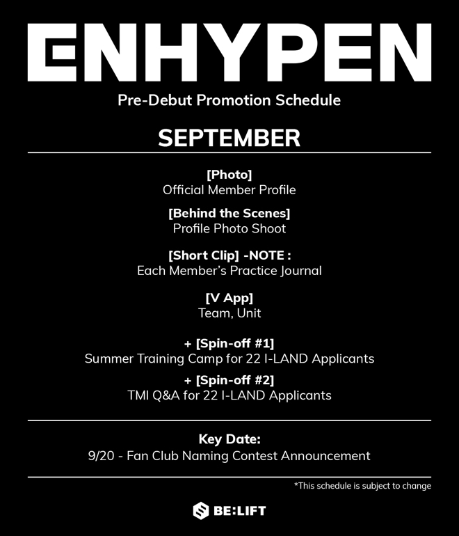 ENHYPENは9月19日(土)、公式SNSを通じて9月のプロモーション活動予定を発表。公式プロフィール写真と撮影ビハインド、メンバーの練習日誌を含むショートクリップ「-note」、チームおよびユニットでの「V LIVE」配信など様々なコンテンツの公開を予告した。