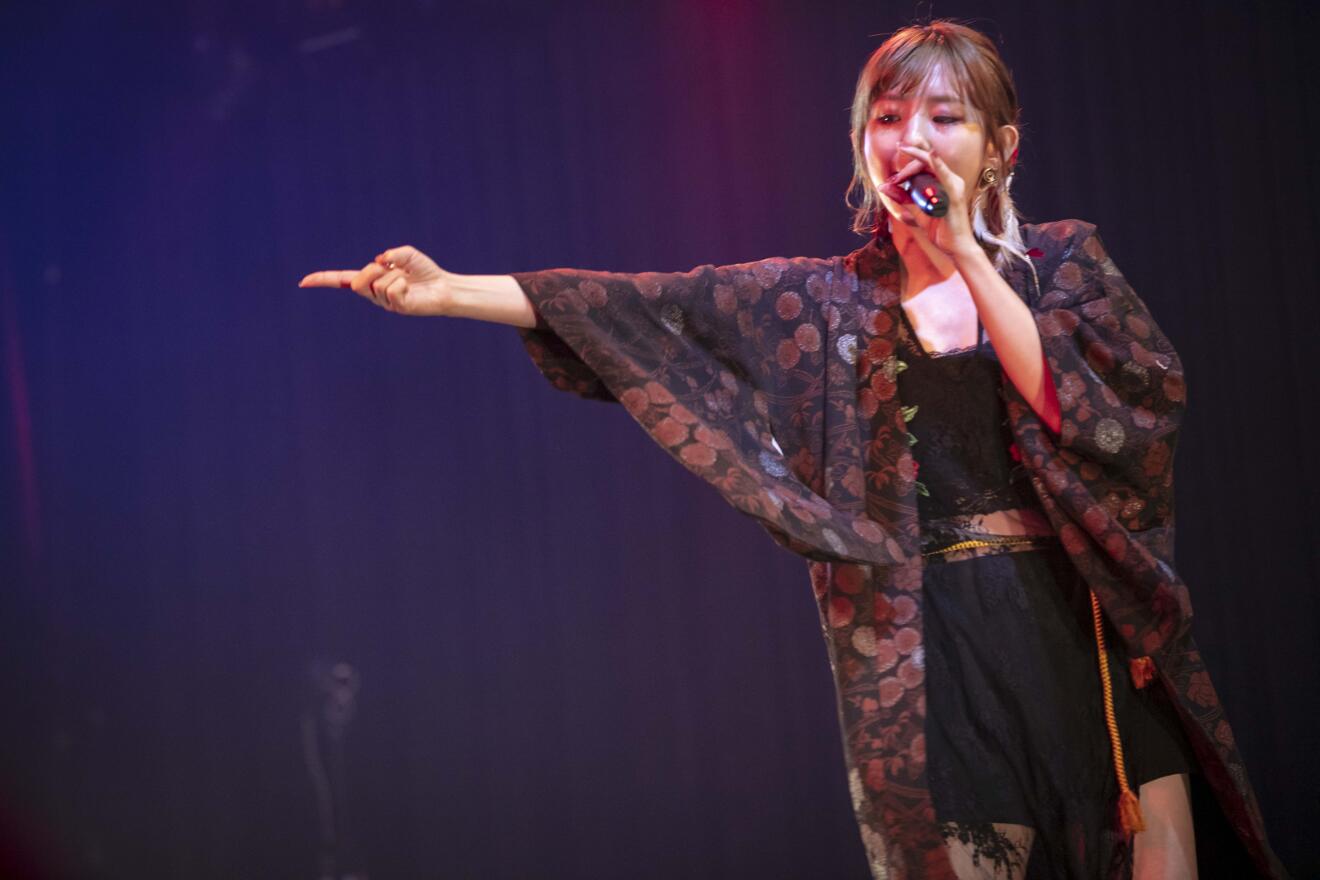 続いて登場したのは、今月末に事務所を退所するため「UNiON STAR’S 」への参加は今回がラストとなるコウ(KOU)。本番前、「アーティストの思いを尊重してくれる事務所で、5年間成長させてもらうことができた。今日は大きくなった自分を見てもらいたい」と意気込みを語っていたが、その言葉どおり、オープニングからアクセル全開のパフォーマンスを披露。彼女がRaniとしてボーカルを務めたガールズロックバンド「Hysteric Lolita」のデビュー曲「絶望のスパイラル」から、バンド解散後ソロになって初の楽曲「××警告」など、所属期間の集大成となるようなセットリストだ。ヘヴィでハードな最新曲「JUMP」では残念ながら全員でジャンプしながら盛り上がることはできなかったが、思い思いのリアクションに込めたアツい思いをぶつけ合いながら、オーディエンスとの一体感を作り上げていた。