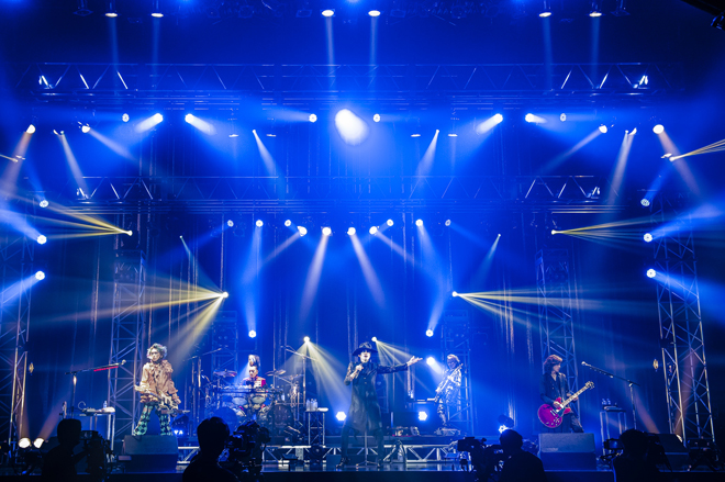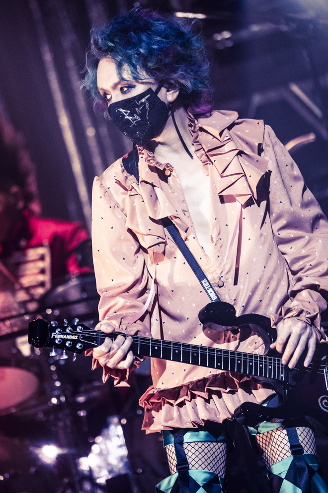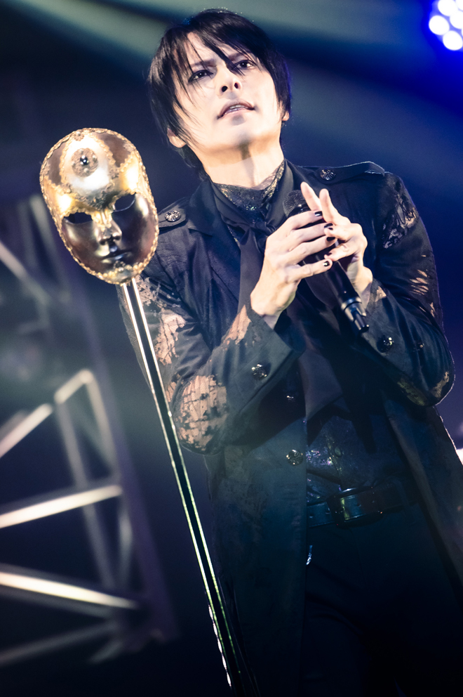 「Hello、みなさん元気? 楽しんでください、アブラカダーブラ」。短い櫻井のMCを挟んで、「SOPHIA DREAM」へ。サイケデリックなメロディと、櫻井と今井のツインボーカルが醸し出す浮遊感があるナンバーだ。また、ヤガミが打ち鳴らすトライバルなリズムと、イントロの星野のコーラスでまるで異国へと誘う「月の沙漠」は、バンドアンサンブルが美しく、黄金のマスクを手にした櫻井が情感豊かなボーカルを聴かせた。「Villain」では、今井が奏でるオリエンタルなメロディと、ヘヴィなデジロックサウンドがゾクゾクさせ、その熱をクールダウンさせたのは「凍える Crystal CUBE ver.」。歌詞をなぞるように表現する櫻井の表情とパフォーマンス、そしてそれに寄り添うバンドサウンドが美しく優しい。その後、照明の落ちたステージで今井のギターソロが空気を転換すると、昭和歌謡調の「舞夢マイム」へと移った。男女の駆け引きを歌う櫻井の唇にひかれた赤いリップの妖艶さがより一層増す。昭和の空気はそのままに「ダンス天国」へ突入。めくるめく倒錯の世界を楽しんだ後は、バンドサウンドにデジタル色が加わりよりダンサブルになったシングル曲「獣たちの夜 YOW-ROW ver.」「堕天使 YOW-ROW ver.」を披露した。