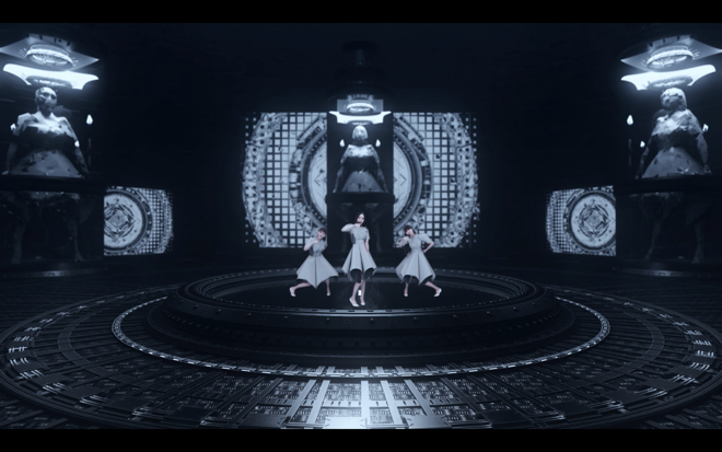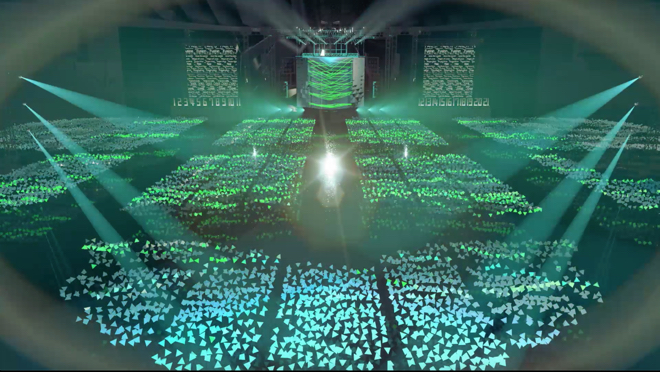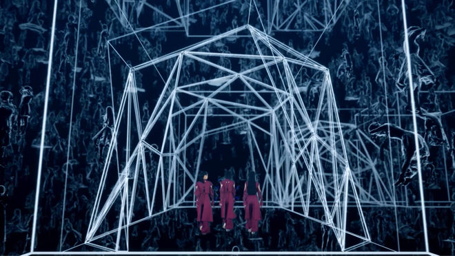 そんな驚きと感動のオープニングから、今度はこのフェスならではの「Imaginary Museum」へとワープ。曲ごとに想像上のミュージアムの部屋を移動していくというカタチでパフォーマンスは進行した。これは、「採った全データを使ったPerfumeミュージアムみたいなものをいつか作りたい」と常々発言している真鍋大度(ライゾマティクス)らしいアイディアと言えよう。お馴染みのライブ演出を基本としながらも、リアルな空間上では不可能なデジタル表現はさながら「エレクトロ・ワールド」。縦横無尽な角度から3人を見られるのもまたデジタルの恩恵で、特に俯瞰からの映像は新鮮だった。3Dなのか、それ以上なのかもうわからない世界だが、とにかくビビッドで美しい。