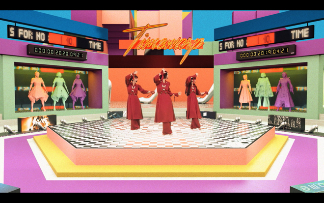 オンラインと聞けば、無観客ライブ配信を思い浮かべる人がほとんどだと思うが、<POP FES>はその名の通りフェス。Perfumeのライブ演出をデジタル技術面で支え続けているライゾマティクスとのタッグで、オンライン上に夢のような世界を出現させた。アクセスすると、そこはいくつもの建物できたフェス会場になっていて、有料コンテンツが観られるメインブースだけでなく、多彩なトーク番組が楽しめるバラエティトークブース、これまでの衣装の詳細が展示されたコスチュームブース、特製グッズ売り場、脱出ゲームが楽しめるコーナー、さらにはフードコートと、無料エリアも大充実。そのどこに行ってもPerfumeがいて、テーマごとに違う3人の表情が観られて、しかも、タイムテーブルが微妙に被ってるからどこに行くか迷って忙しい。つまり、まるごとPerfumeワンダーランド状態のフェスというわけだ。