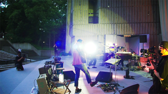 その日比谷野音でのCaravanのライブ映像をつなぎ合わせた、豪華な待機映像が20分ほど続いた後、画面が切り替わる。「2020年 コロナ夏」という文字に続いて、蝉の声と緑に包まれながら、お客の動線で日比谷野音に入って行くCaravanの後ろ姿が映し出される。