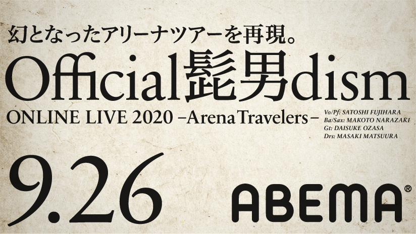 Official髭男dismが、9月26日(土)20時より初のオンラインライブ<Official髭男dism ONLINE LIVE 2020 – Arena Travelers ->を7つの配信メディアにて配信する。このうちのABEMAにて、全メンバーからの直前コメントが発表された。