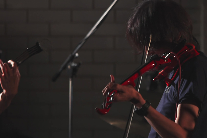 その様子を感じ取ったROVOのメンバーは、次の瞬間、一斉にキメを入れた。同時に映像はカラーに切り替わり、メンバーの躍動的な動きを克明に伝え始める。9月に発表したばかりの12thアルバム『ROVO』のオープニングも飾るナンバー「SINO RIHZOME」が、この日の1曲目だ。勝井祐二(Violin)、山本精一(G)、原田仁(B)、益子樹(Syn)、芳垣安洋(Dr, Per)、岡部洋一(Dr, Per)。彼ら6人から変幻自在に溢れだす音やフレーズが、観客の精神に作用するような音の世界を築き上げていった。先を予測できない複雑で奇怪なアンサンブルはとてつもなく刺激的だ。