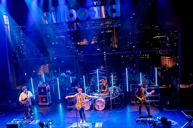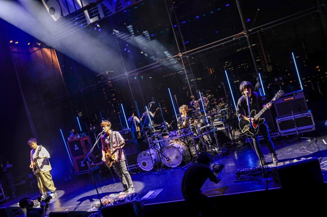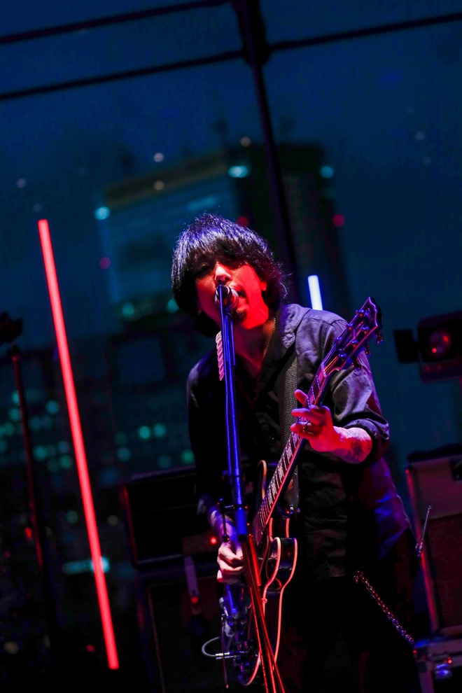 彼らが1曲目に選んだのは、8月に発表したセルフカバーアルバム『Futures』からの「NEW HORIZON」。メンバーの後ろ側には、ガラスを通して東京の景色が広がっている。まるで天空のステージで響かせるようなライブだ。そこから未来に向けた咆哮とも言える楽曲を轟かせる姿は、とてつもなくカッコいい。