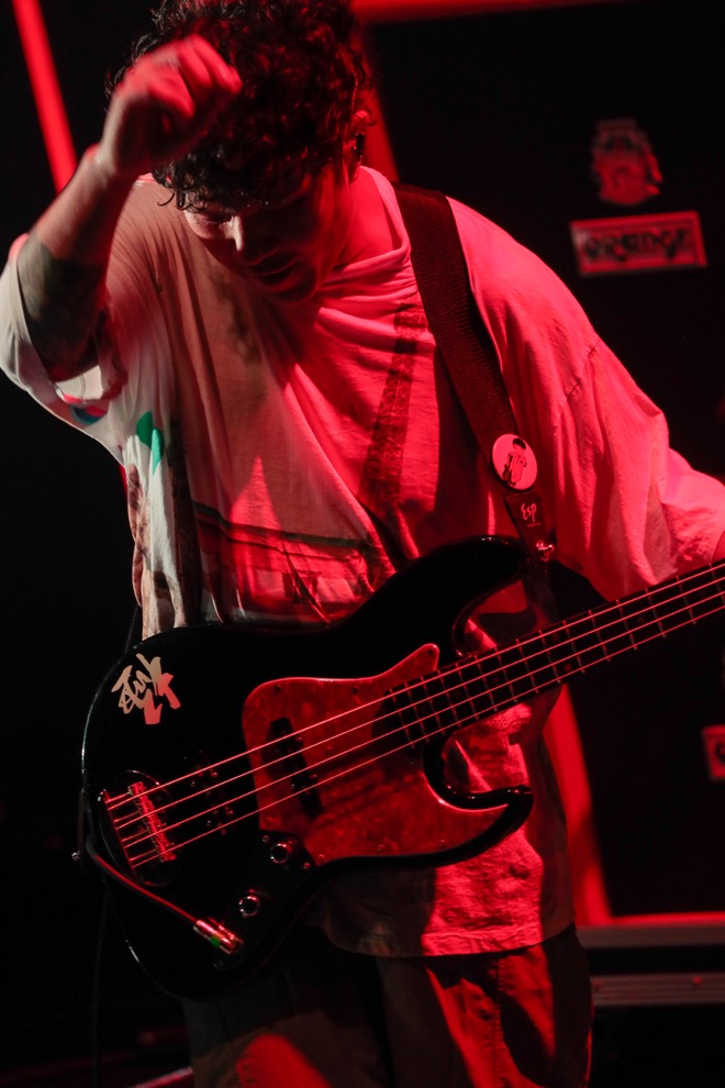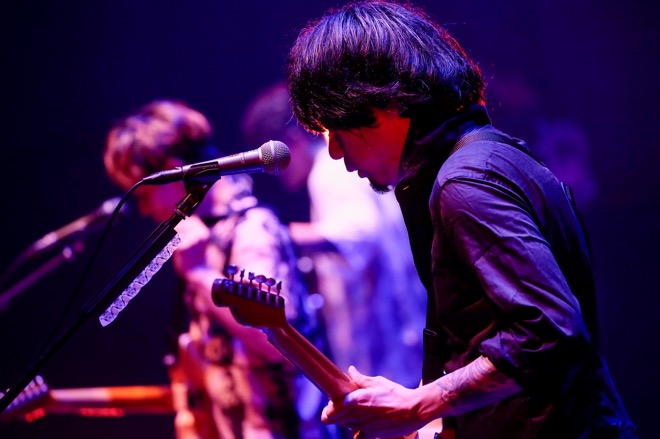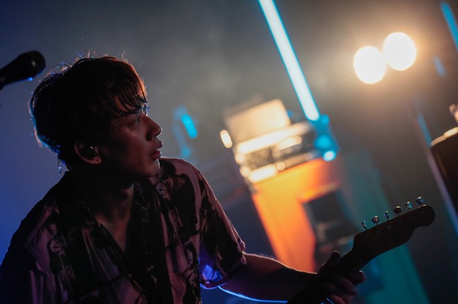 薄暗いステージに並ぶエフェクターと、そのスイッチを踏む足元。生方真一(G)の鳴らすギターサウンドを合図に、村松 拓(Vo, G)、日向秀和(B)、大喜多崇規(Dr)も、軽く音出しを始める。セッションのように呼吸を合わせたところで、Nothing’s Carved In Stoneのステージは始まった。