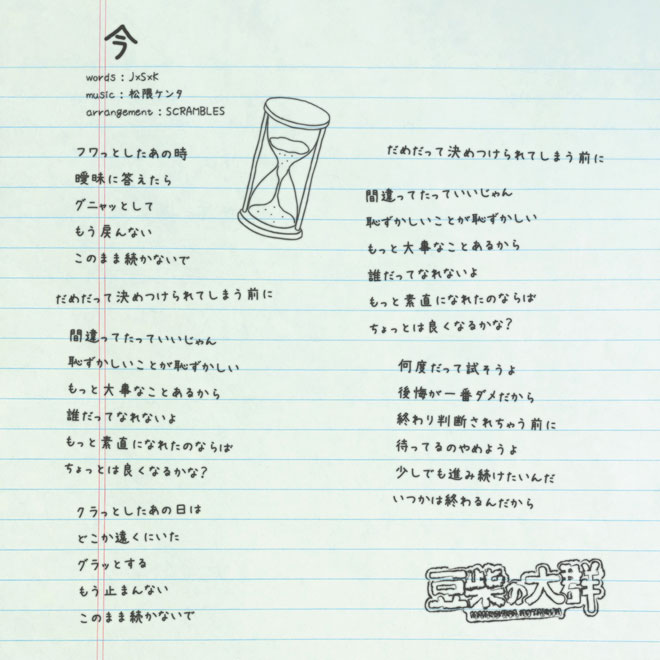 豆柴の大群が10月7日に発売するメジャーデビューシングル「AAA」に収録される3曲目の新曲タイトルが「今」に決定したことが発表された。あわせて歌詞も先行公開された。