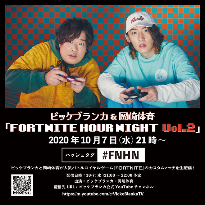 音楽と共にゲームを愛するビッケブランカと岡崎体育が10月7日21時より、ビッケブランカ公式YouTubeチャンネルで生配信『FORTNITE HOUR NIGHT vol.2』を開催することがわかった。