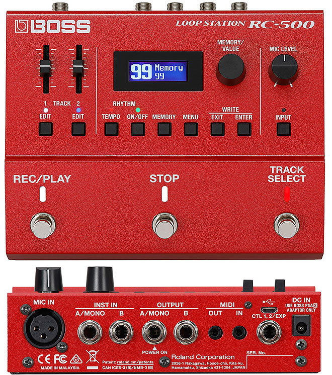 一方の「RC-500」は本体パネルにトラック・フェーダーとマイク・レベルつまみを装備し、ダイレクトに調整することが可能。演奏中でもスムーズに操作できる。楽器用入力端子に加えファンタム電源機能付きXLRマイク入力を備え、ギターや電子楽器はもちろん、ボーカルなどさまざまなソースに対応する。また、2トラックのループを使い、「Track 1」と「Track 2」を交互に再生して楽曲に展開を持たせたり、同時に2つのトラックを再生して重厚なサウンドを生み出すなど、ダイナミックなループ・パフォーマンスを実現する。