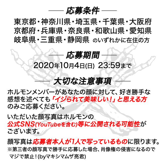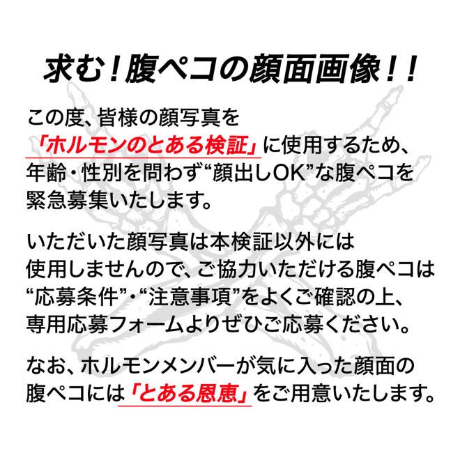 対象となる腹ペコ(ホルモンファンの呼称)は、東京、神奈川、埼玉、千葉、大阪、京都、兵庫、奈良、和歌山、愛知、岐阜、三重、静岡の在住者。寄せられた顔写真は“ホルモンのとある検証”に使用されるという。ホルモンメンバーが気に入った顔面の腹ペコには、“とある恩恵”も用意されているそうだ。