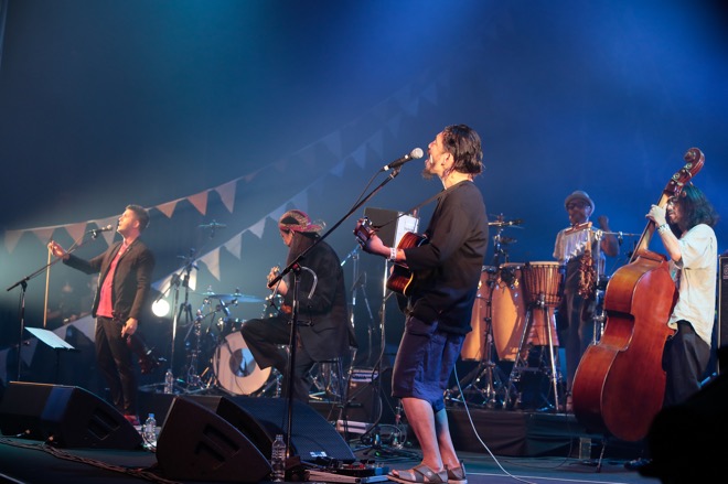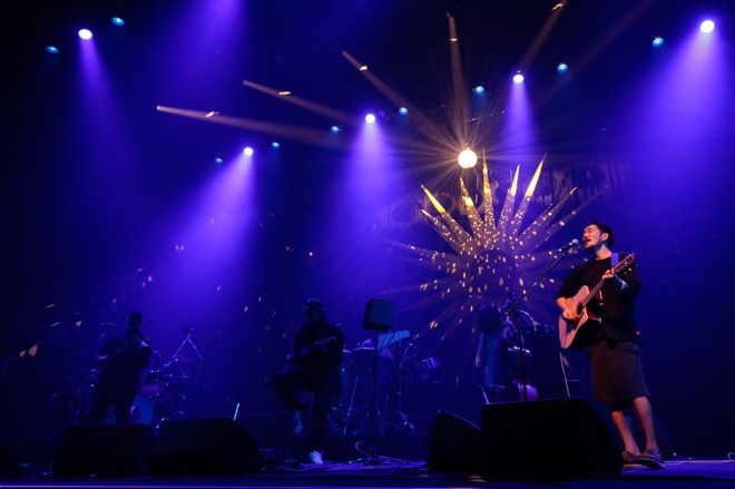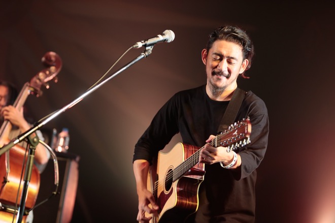 中盤は、<THE SOLAR BUDOKAN>のオーガナイザーである佐藤タイジをスペシャルゲストに迎えてのセッション。「ミスターソーラー、奥田民生!」と呼び込むTOSHI-LOWに、「こんばんは、奥田民生です」と乗っかる佐藤タイジ (ちなみにこの日、奥田民生はOAUの前に登場)。アコースティック編成のOAUのステージに、エレキギターを持ち登場したことをさらにTOSHI-LOWに突っ込まれながらも、この日限りのスペシャルなセッションで「Where have you gone」と「Americana」を聴かせてくれた。特に「Americana」のセッションは最高で、エキゾチックなKOHKIのギターに佐藤が艶やかなフレーズを絡ませ、OAUサウンドをより重厚に編み上げていく。スケール感がある鉄壁の弦楽器たちの絡みと、ダイナミックで伸縮性のあるビートが織りなすサウンドに、観客の拍手のトーンも上がった。