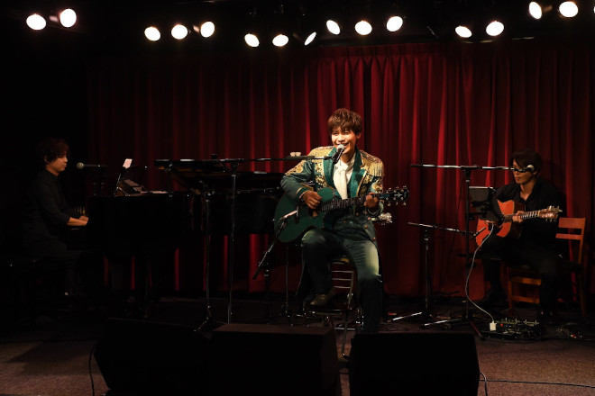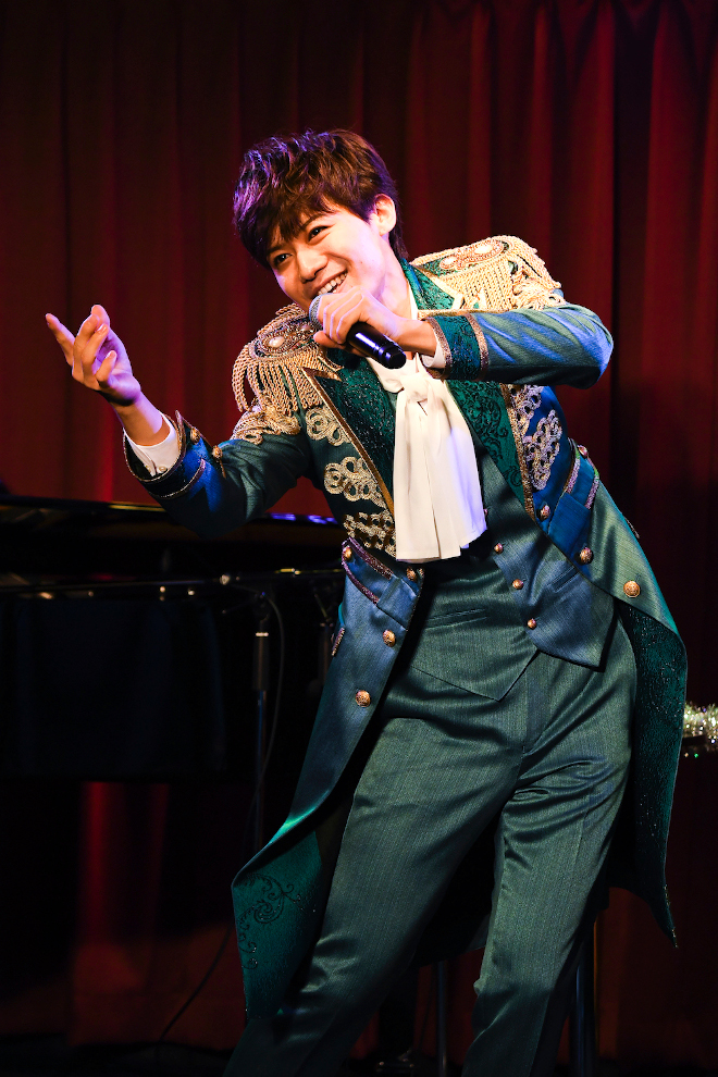 セカンドコンサートを銘打った今回のステージ。1曲目は自身のセカンドシングル「君を求めて」。今回が初披露となった華やかな上下エメラルドグリーンの衣装は今回のステージのために特別にあつらえたものだという。プリンス風の衣装にご覧いただいているコメントも「王子―!!王子―!!」と大歓声が沸き起こった。サビで印象的な「君を 君を 求めて」というところの指差しポーズも決まり、配信LIVEながら出だしから最高の盛り上がりをみせた。