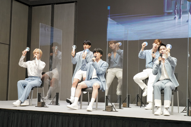 また、アルバム『The STAR』リリース記念のショーケースオンライン生配信イベントの開催も11月14日に決定。詳細は後日、公式サイトで発表される予定だ。さらに、初のオンライン単独ライブ<JO1 1st Live Streaming Concert「STARLIGHT」>の開催も決定した。與那城奨はライブについて「ずっとJAM(JO1ファンの呼称)の方の前でライブはしたかったんですけど、この状況がありますので、僕たちができることとして、JAMの皆さんへ、オンラインを通じて新しい見せ方ができたらなと思います」と気合い十分のもよう。そんなライブ漬けになるJAMのため、ライブで必須のペンライト“JO1 OFFICIAL LIGHT STICK”の発売も決定。スマートフォンと連携して自分の推しの色をチョイスできたり、生配信中に曲に合わせてペンライトが連動して自動で変わったりするなど、商品の魅力を紹介した白岩瑠姫は「おうちにいるJAMの方も、会場で一緒に盛り上がっているかのように楽しめます」と説明し、メンバー全員で掛け声のデモンストレーションも行った。