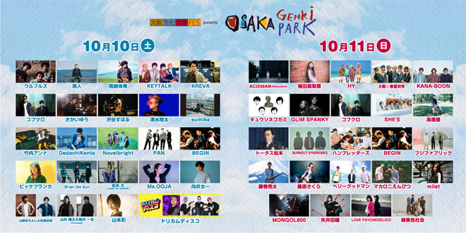 <大阪文化芸術フェス presents OSAKA GENKi PARK>は10月10日、11日に開催。2日間で全46組のアーティストが出演するライブステージのほか、1970年に開催された大阪万博の軌跡を巡るツアーや、大阪ゆかりの作家たちが『2025大阪・関西万博』に向けて「1970→2025」というテーマで描くライブペインティング、大道芸人によるパフォーマンスなど様々なプログラムが繰り広げられる。