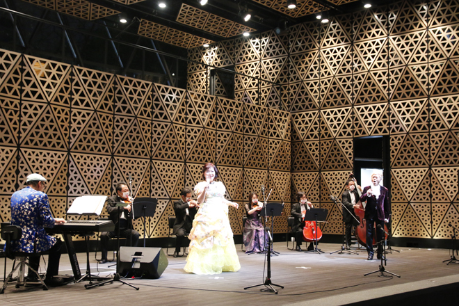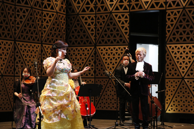 コントラバス、チェロ、ビオラ、第二バイオリン、第一バイオリンがステージに現れ、一曲目が始まる。ジュゼッペ・ヴェルディが1853年に発表したオペラ『椿姫』から「乾杯の歌」だ。事前には青島の分かりやすい楽曲解説が入り、よりオペラを楽しめる仕掛けになっている。演奏が始まると、シャンパングラスを手にしたテノールの小野勉、ソプラノの横山美奈が豪華な衣装をまとい登場。ハリのある若々しいテノール、そして伸びやかなソプラノに初っ端から引き込まれる。ステージ上は悪天候を感じさせない夢の舞台のようだ。