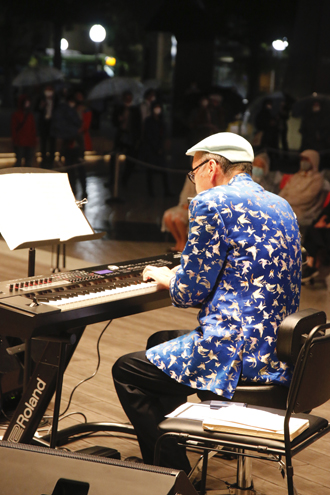 この日はあいにくの小雨模様。とはいえ本公演を楽しみにしていた観客で会場は徐々に埋まっていく。19時、定刻に青島が登場すると予定外の演奏が始まった。「あめふり」である。天気を踏まえつつ、テレビなどでおなじみの思わず笑みが漏れる“青島トーク”から公演がスタートした。