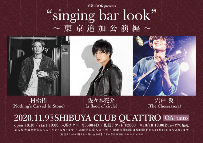 村松拓(Nothing’s Carved In Stone)、佐々木亮介(a flood of circle)、宍戸翼(The Cheserasera)が出演する、千葉LOOK主催による弾き語りツアーの追加公演が決定した。