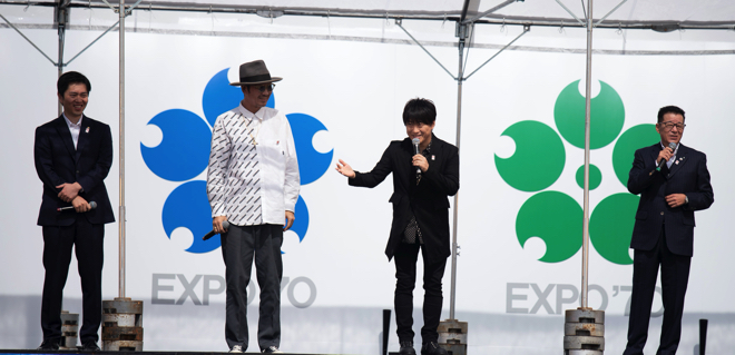 セレモニーには吉村大阪府知事と松井大阪市長も参加し、檀上ではアンバサダーであるコブクロとともにトークを交わした。「大阪を盛り上げるために何でもやる!」と強く意気込みをコブクロが語ると、松井市長からは「2025年の公式テーマソングをやっていただこう!」とサプライズ発表があった。