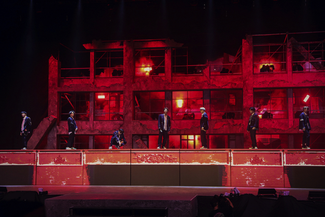 約150分のステージはマーチングバンドのパフォーマンスに導かれて幕を開け、最新アルバム『MAP OF THE SOUL : 7』のリード曲「ON」で壮大にスタート。『MAP OF THE SOUL』シリーズとその公演では「デビューから今までの7年という時間と様々な悩み、メンバー一人ひとりの楽曲と素直な気持ちを伝えようとたくさん準備した」という通り、最新作の収録曲を中心に、デビュー曲「No More Dream」をはじめ「N.O.」「DOPE」「DNA」などの楽曲も織り交ぜながら、グループの7年の歩みを振り返るようなステージが披露された。