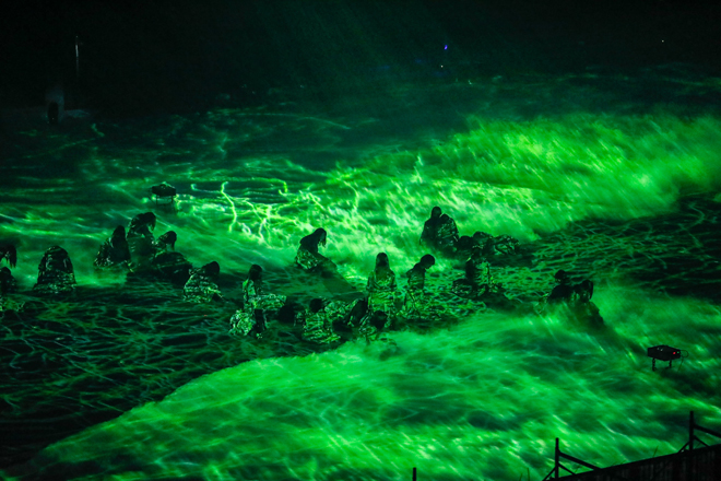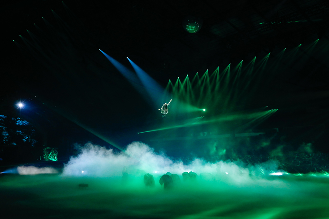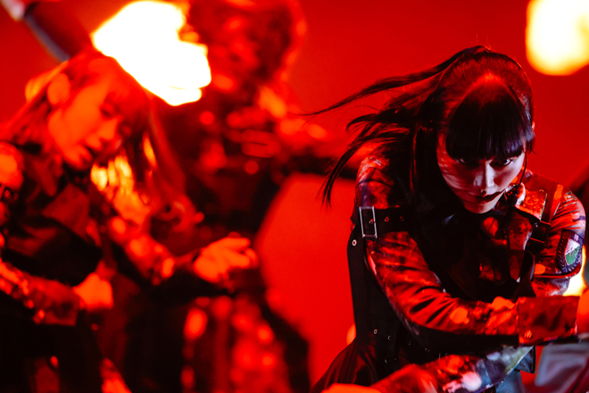 アリーナ奥の重厚感ある門から総勢21名のダンサーたちが荒々しく登場すると、場内に緊張感が漂う。ステージ中央に鎮座し、カメラに向かって煽ってみせるダンサーたち。MA-1を羽織り気合い十分のメンバーがダンサーと向き合うと、一触即発の雰囲気へ。激しいぶつかり合いから「ガラスを割れ!」に突入すると、ステージの四方から炎が吹きあがる迫力満点のステージングを繰り広げた。