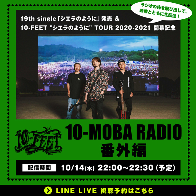 10-FEETは本日、約1年3か月ぶりの新作となるシングル「シエラのように」をリリースし、同作を引っさげた全国ツアー<10-FEET “シエラのように” TOUR 2020-2021>を京都・KYOTO MUSEでスタートさせる。『10-MOBA RADIO 番外編』は、ツアー初日公演を終えたばかりのメンバーの生の声がいち早く聞ける特別番組となる。