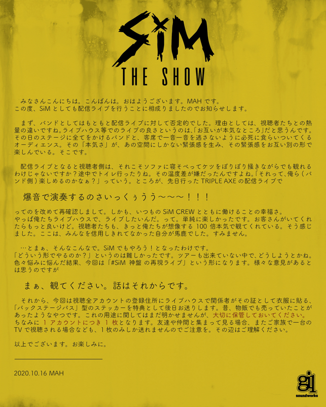 単独名義で初の配信ライブとなる<SiM THE SHOW 「THANK GOD, THERE ARE HUNDREDS OF WAYS TO KiLL ENEMiES」>は、10月24日(土)21時より「PIA LIVE STREAM」と「Streaming+」で配信される。当日は、彼らが6月に発表した約4年ぶりのフルアルバム『THANK GOD, THERE ARE HUNDREDS OF WAYS TO KiLL ENEMiES』を完全再現したステージが披露されるという。新型コロナウイルスの影響でアルバムのリリースに伴う全国ツアーも開催延期となる中、ついにバンドが繰り出す“100通り以上もの敵を倒す方法”を目撃できる貴重なライブということで注目を集めそうだ。