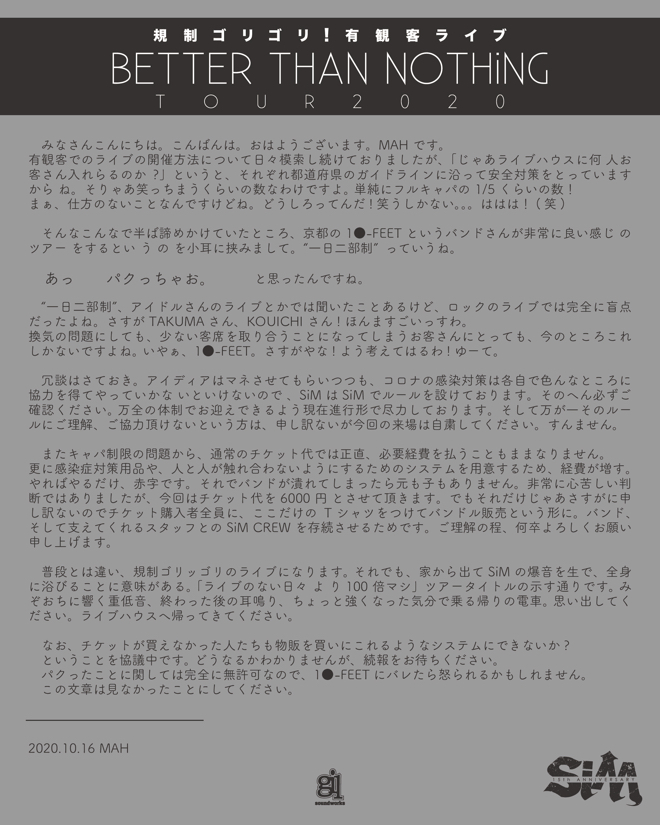 SiMが、配信ライブ<SiM THE SHOW 「THANK GOD, THERE ARE HUNDREDS OF WAYS TO KiLL ENEMiES」>およびライブツアー<BETTER THAN NOTHiNG TOUR 2020>の開催を発表した。