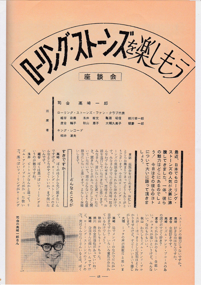 65年に友人達とRSFC結成。僕は高校受験を控えていたので脇役、初代会長は今でも付き合っている1年先輩の細川さん。ミュージック・ライフ同年8月号(表紙はあのビートルズ&和服の星加ルミ子さん)掲載“座談会 ローリング・ストーンズを楽しもう”に臨席している。そして66年春から二代目会長に就任した。