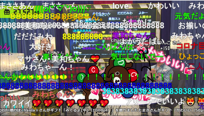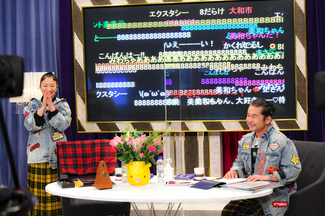テレビ番組のようなセットの中に、中村正人と吉田美和が現れ、本日の進行はなんとこの2人だ。登場の瞬間の盛り上がりが画面を覆い尽くすコメントの多さでわかる。そこはさすがニコ生といったところだ。今回のイベントの“制服“という、デニムジャケット(これまでリリースしたアルバムタイトルのワッペンが付けられている)に身を包み、律儀に、かつツボを心得た進行をしていく中村と、その横で立ったり座ったり、ときに話の流れとまったく関係のないトークをぶっ込んだりする、あまりにもフリースタイルな吉田美和とのコンビネーションは、ともすれば彼らの音楽以上にスリリングで見ていて飽きない。それにしても、ライブ以外で吉田美和がしゃべったり動いたりしているというのは、はっきり言って記憶にない。もうそれだけでも見た価値があったと思わせてくれる貴重なイベントだ。