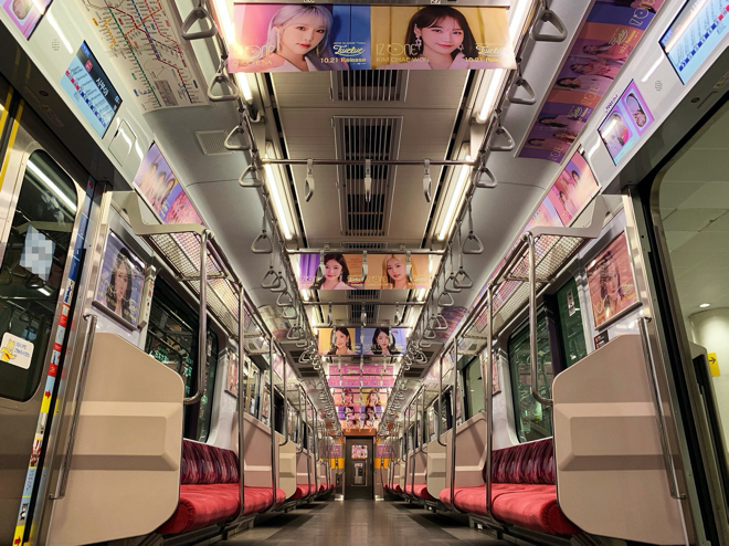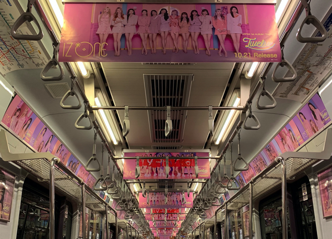 この「IZ*ONEトレイン」では、車内の中吊り広告や車内ビジョンがIZ*ONE仕様のデザインに。メンバー集合やソロなど、初公開を含む21種類のビジュアルが使用されるということだ。