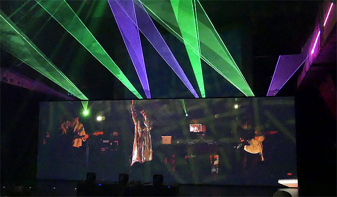 ▲照明演出によってはスクリーンが見づらくなる場面も。プロジェクターによるスクリーンへの投影よりもLEDパネルなどのほうがよいのでは? と思ったが、コストを抑えどこの会場でも迅速にセッティングできるという点からスクリーンが選択されているとのこと。聞けば納得。