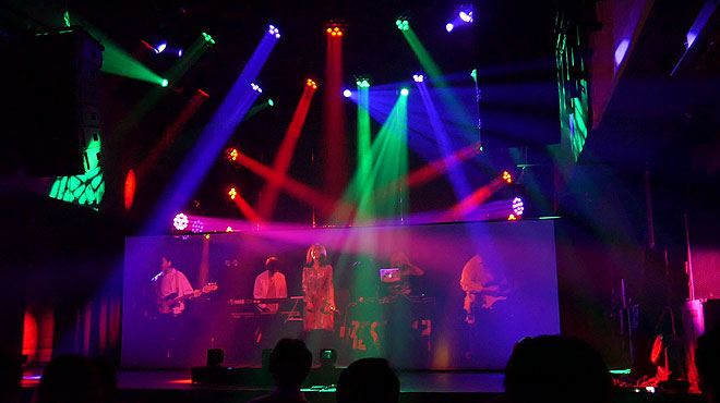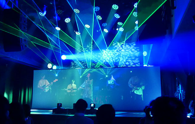開演前のライブハウスのステージ上、バンドメンバーが立つはずの位置には大きなスクリーンが張られており、照明やスピーカーなどは通常のライブと同様にセッティングされている。会場が暗転するとスクリーン上にバンドメンバーが、まさにそこにいるかのような大きさで映し出され、演奏がスタート。迫力あるサウンドはまさにライブそのもの。激しく動くライブならではの照明も気分を大いに盛り上げてくれる。