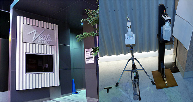 ▲会場となったVeats Shibuya(左)。入り口には「Yamaha COVID-19 Project」で製作された消毒液スタンドが設置されていた(右)。ハイハットのペダルや鍵盤でプッシュできる。