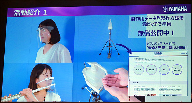 ▲「Yamaha COVID-19 Project」の活動も紹介。左上が一般的なフェイスシールド。その下がフルートやリコーダーを吹く時に呼気が漏れないようにする鼻から下のフェイスシールド。右はドラムのハイハットスタンドを使用した消毒液スタンド。一刻も早く世界規模で配りたいという思いから、製品化を目指すのではなく、3Dプリンターですぐ出力できる製作用データを無償公開している。