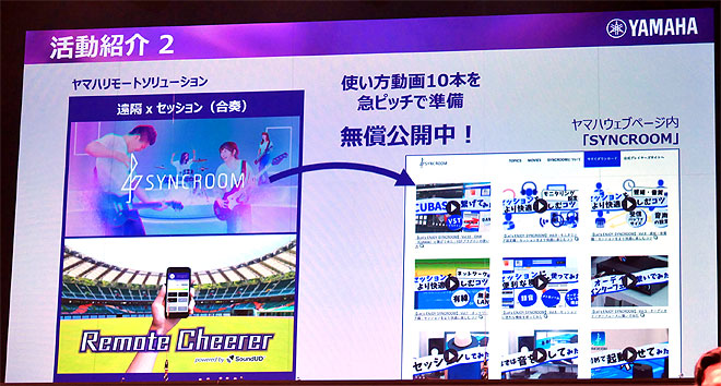 ▲遠隔地でセッションできるアプリケーション「SYNCROOM」、スタジアムやライブに遠隔地から声援を会場に直接音で届けたいという思いを叶える“リモート応援システム”「Remote Cheerer」とも連携しながら新しい価値を作っていこうとしている。同プロジェクトではSYNCROOMの使い方動画を作成。