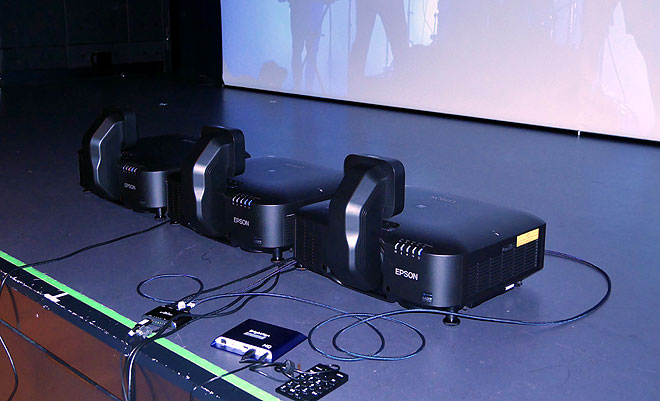 ▲今回のイベントでスクリーンを映像を映し出していたのは、ステージ上に設置された3台のプロジェクター。ライブハウスの既存の設備に、このプロジェクターと大型のスクリーンを加えることでDistance Viewingが可能になる。