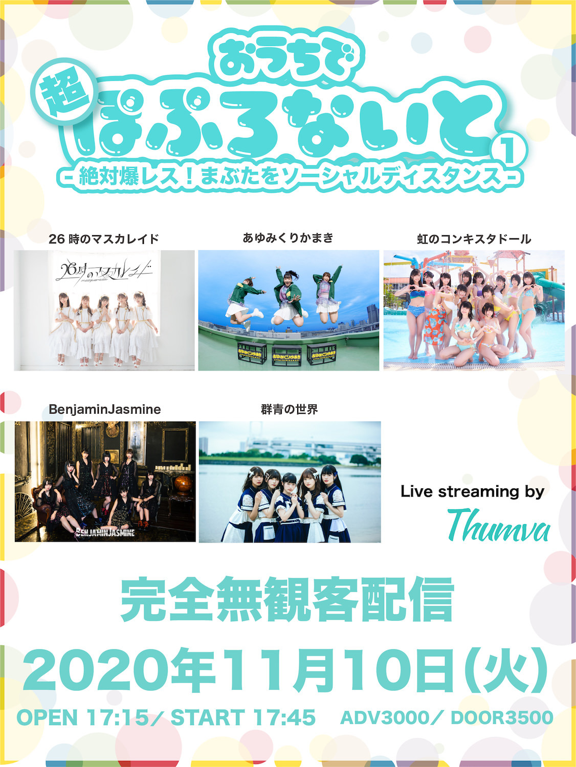 アイドルメディア『Pop’n’Roll』<ぽぷろないと>の無観客生配信版となる<超おうちでぽぷろないと1 -絶対爆レス!まぶたをソーシャルディスタンス->が、2020年11月10日(火)にライブ配信プラットフォーム『Thumva』にて開催されることが決定した。本イベントには26時のマスカレイド、あゆみくりかまき、虹のコンキスタドール、BenjaminJasmine、群青の世界が出演する。