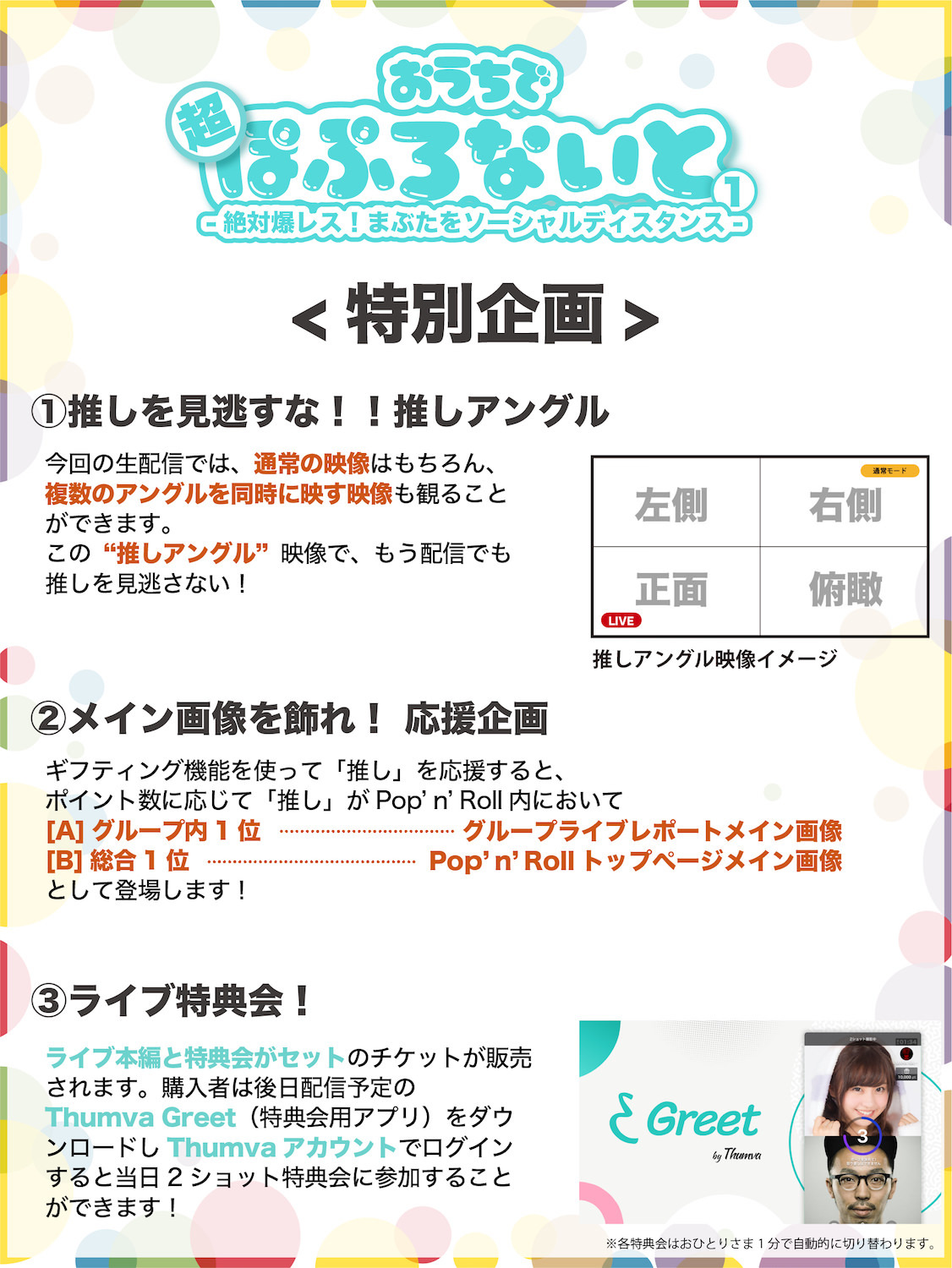 ライブ配信プラットフォーム『Thumva』のギフティング機能を用いた<推し応援企画>を実施。今回、全グループの各メンバーのソロギフティングが用意されており、グループ内で最もポイントを獲得したメンバーは、後日Pop’n’Rollに掲載されるライブレポートにおいてメイン画像として登場。さらに、全グループの中で最高ポイントを獲得したメンバーは、Pop’n’Rollのトップページのメイン画像に登場する。