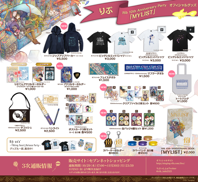 また、10月29日(木)17:00からは、<Rib 10th Anniversary Party「MYLIST」>ライブオフィシャルグッズの3次通販がセブンネットショッピングでスタート。公演中止に伴い会場のみの販売を予定していた限定グッズなど、新アイテムがラインナップに加わっており、数量限定となっているため早めにチェックを。