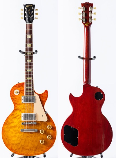 | ▲Gibson Les Paul Classic 4-9014 カスタムショップ製のレスポールクラシックは、1960年製のスリムネックを採用、キルテッドメイプルトップの木目が美しいモデルだ。「1995年くらいに入手した」という1994年製。「Secret Night ~ It’s My Treat ~ [WANDS 第5期ver.] 」で使用。 |