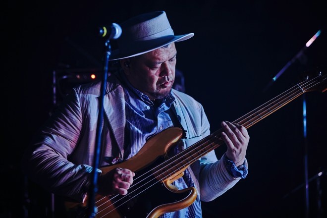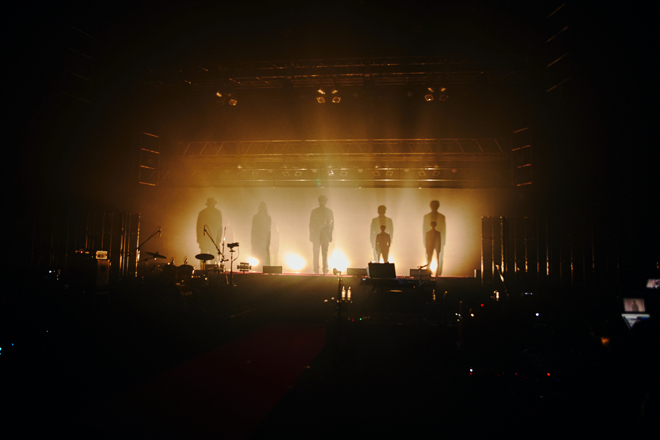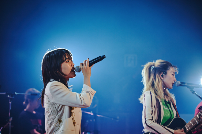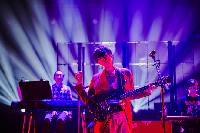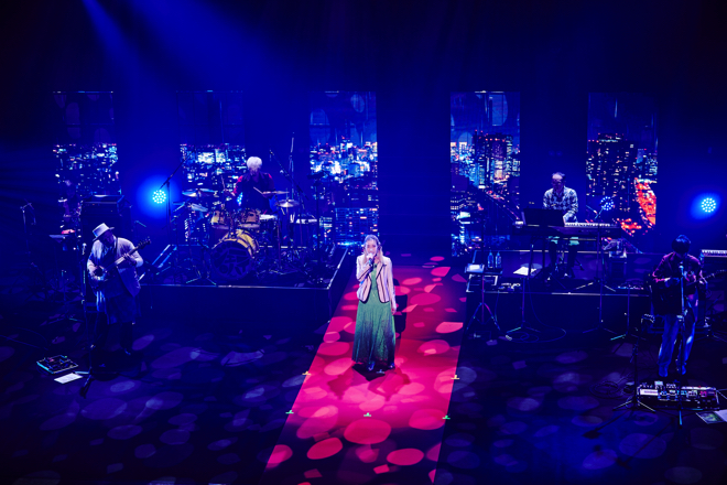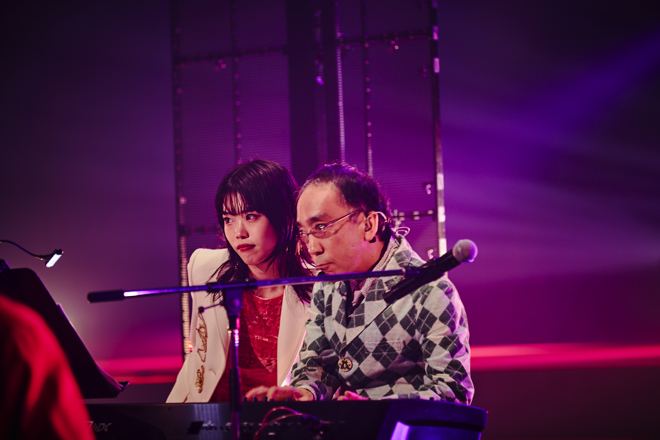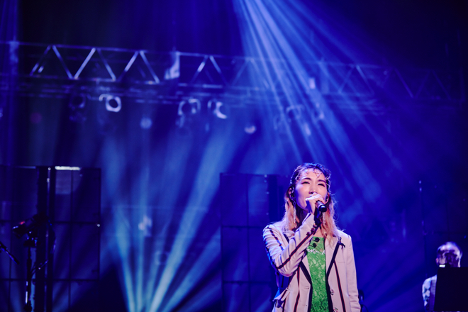 中盤の「強がりと弱虫」では、先ほどまでの雰囲気と一転し、しっとりとした聴かせるサウンドで楽曲を披露した。この楽曲ではソロ演奏とともに改めてメンバー紹介を行い「東京は雨」では雨の降る東京の街並みをイメージした映像をバックに切ないムードを儚げな声で表現した。