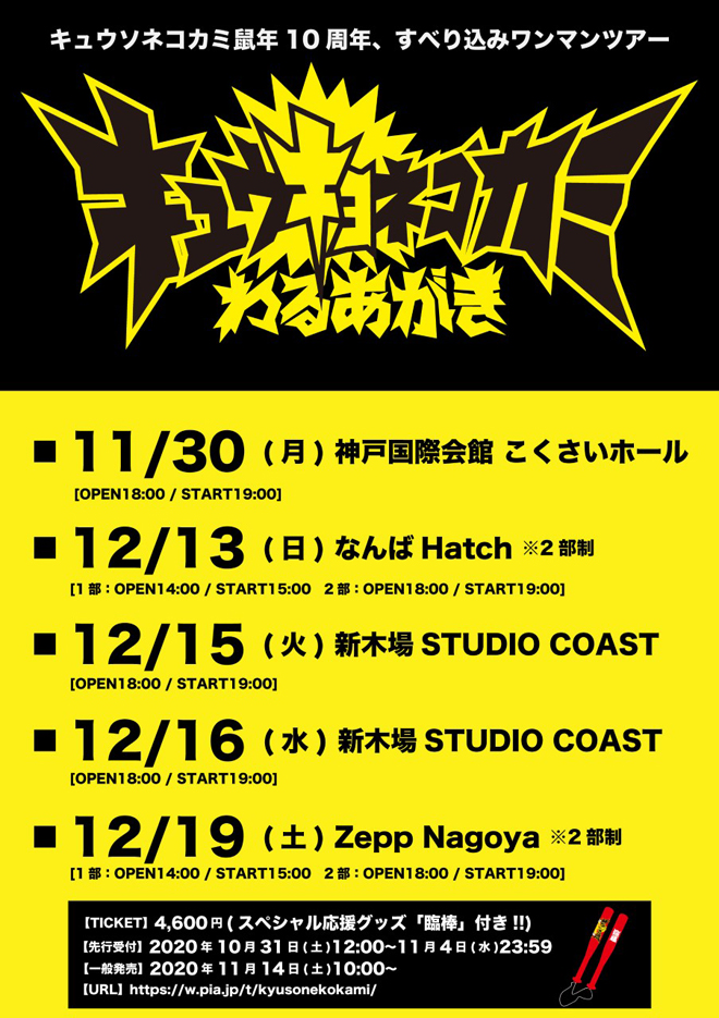 2020年は、キュウソネコカミ結成10周年かつネズミ年というメモリアルなイヤーだったが、新型コロナウィルス感染症対策により、予定していたツアーやワンマンライブが全て中止に。だが「キュウソはそれでも諦めない!結成10周年イヤーはまだまだ終わらせない!」というキュウソならではの“わるあがき”として本ツアーの開催が急遽決定したようだ。