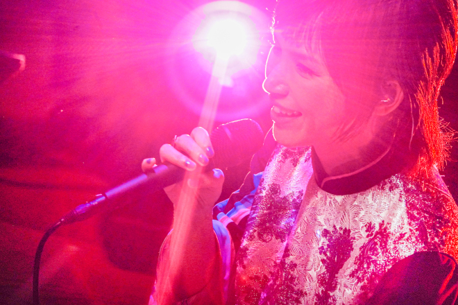 4曲目はピアノから始まる「輝く月のように」。かつて志帆の心が隠れるように彷徨っていたときに「光をぶつけてくれた」そのひとへの感謝の気持ちから書かれたこの曲も、現在のこのバンドの演奏で歌われると、現在の輝きが放たれる。間奏においての稲泉と山本のコーラスがとてもいい。「見て、光るよ~」と、どこまでも伸びていく志帆の歌が笑顔とセットになって、聴いている我々に安らぎにも近い幸福感を与えてくれる。続く5曲目は昨年のデジタル・シングル曲「フレア」だ。ハンドクラップで始まり、「みんな一緒に歌ってください」と志帆。ライブ会場にいる感覚がよみがえってくる。「どこかでまた会えるまで 冷たい雨に負けるもんか」。そのフレーズもまた、去年聴いたときよりも励ましのトーンを伴いながら響いてくるのだった。