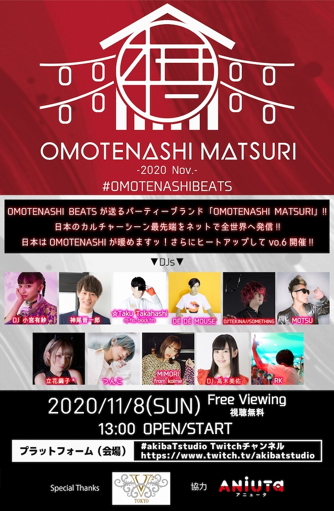 <OMOTENASHI MATSURI -2020 November->はライブストリーミング配信プラットフォーム・Twitchにて視聴無料で実施。出演したのはMOTSU、RK、DJ’TEKINA//SOMETHING、MIMORI from kolme、立花繭子*、つんこ、DJ 高木美佑、DÉ DÉ MOUSE、☆Taku Takahashi(m-flo, block.fm)、DJ 小宮有紗、神尾晋一郎の11組で、約6時間にわたるDJイベントを繰り広げた。