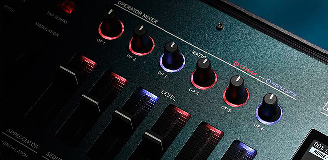 ソフトウェアではけっして得られない、ハードウェアならではの操作感の追求の象徴といえるのが、「OPERATOR MIXER」と名づけられたパネル左側に配置された6組のノブとスライダー。キャリアかモジュレーターか。アルゴリズムによって変化するオペレーターの役割と関係性をひと目で認識できる2色のLED照明を搭載。それはキャリアならピッチ/音量を、モジュレーターなら音色の明るさ/倍音の強さを、ダイレクトに調整できる。まさにミキサー、またはドローバーのように音を足し引きすることで、予測不可能なFMのサウンド・コントロールを、指で支配できるものへと一変させる。さらにパネル右のエンコーダーと中央の大型OLEDのグラフィカルなパラメーターでフルエディットも迷わず行える。
